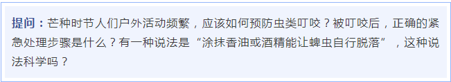 芒種時(shí)節(jié)戶(hù)外活動(dòng)需要警惕蚊蟲(chóng)、蜱蟲(chóng)、恙螨和隱翅蟲(chóng)等侵襲。蜱蟲(chóng)吸附皮膚,吸血后體積非常大,往往超過(guò)它們身體的5倍以上,它的唾液里往往攜帶多種導(dǎo)致萊姆病、森林腦炎、發(fā)熱伴血小板減少綜合征等疾病的病原體;恙螨幼蟲(chóng)藏在草葉腐土中,人被叮咬后,皮膚上會(huì)形成綠豆大小的紅腫水泡,中間可能有焦痂;隱翅蟲(chóng)體液接觸皮膚會(huì)引起條狀潰爛。這些蟲(chóng)子在氣溫25攝氏度、濕度80%的潮濕環(huán)境中最活躍,尤其喜歡棲息在高草區(qū)、灌木叢和積水附近。