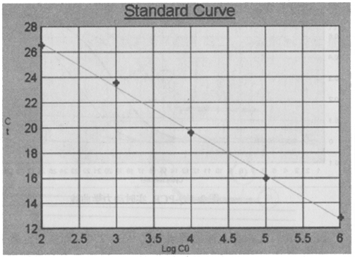 ABI公司首先根據(jù)上述原理研制了ABI 7700 等系列定量PCR儀,在PCR反應(yīng)中設(shè)置標(biāo)準(zhǔn)模板系列(一般5~7個(gè)標(biāo)準(zhǔn)濃度)反應(yīng)管和空白對照管。通過實(shí)時(shí)檢測反應(yīng)管中的熒光信號,計(jì)算出RQ+、RQ-、△RQ。RQ+代表樣品管熒光報(bào)告基團(tuán)發(fā)光強(qiáng)度與淬滅基團(tuán)發(fā)光強(qiáng)度的比率,RQ-代表空白管中二者的比率,△RQ(△RQ = RQ+-RQ-)代表PCR過程中熒光信號變化量。當(dāng)熒光信號增強(qiáng)到某一閾值(根據(jù)熒光信號基線的平均值和標(biāo)準(zhǔn)差,計(jì)算出以99.7%的置信度大于平均值作為閾值)時(shí),標(biāo)準(zhǔn)模板反應(yīng)管所用的循環(huán)次數(shù)(Ct值)就被記錄下來。Ct值與標(biāo)準(zhǔn)模板數(shù)量的對數(shù)值之間有嚴(yán)格的線性關(guān)系[3],利用系列標(biāo)準(zhǔn)模板的Ct值,制成標(biāo)準(zhǔn)曲線(圖3),根據(jù)待測樣品的Ct值,就可在標(biāo)準(zhǔn)曲線中確定待測樣品起始的DNA數(shù)量。根據(jù)數(shù)據(jù)處理,即可得出定量結(jié)果。探針設(shè)計(jì)一般應(yīng)符合以下條件[2]:①探針長度應(yīng)在20~40個(gè)堿基左右,以保證結(jié)合的特異性。②GC堿基含量在40%~60%,避免單核苷酸序列的重復(fù)。③避免與引物發(fā)生雜交或重疊。④探針與模板結(jié)合的穩(wěn)定程度要大于引物與模板結(jié)合的穩(wěn)定程度,因此探針的Tm值要比引物的Tm值至少高出5℃。另外,探針的濃度,探針與模板序列的同源性,探針與引物的距離都對實(shí)驗(yàn)結(jié)果有影響。