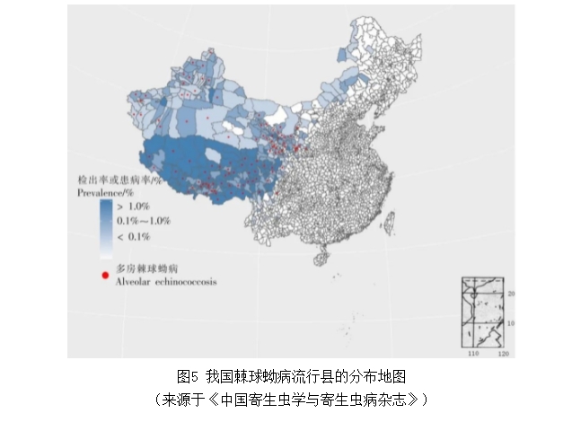 一些研究結(jié)果認(rèn)為細(xì)粒棘球絳蟲(chóng)可能起源于中東地區(qū),在新石器時(shí)代(約公元前1萬(wàn)年)開(kāi)始向世界其他地方擴(kuò)散,并且從大航海時(shí)代(15到17世紀(jì))亦即棘球絳蟲(chóng)的發(fā)現(xiàn)時(shí)代開(kāi)始在全球范圍內(nèi)加速傳播。受限于這種寄生蟲(chóng)極其微小的形態(tài),我國(guó)古代并沒(méi)有關(guān)于棘球蚴病或者棘球絳蟲(chóng)的直接記錄。歷史上,我國(guó)境內(nèi)報(bào)道的首個(gè)棘球蚴病病例是在1905年,但是患者為歐洲人,屬于輸入病例。我國(guó)首個(gè)本土病例發(fā)現(xiàn)于1908年(清·光緒三十四年)的山東省青島市。這些報(bào)道都是由青島德占時(shí)期的軍醫(yī)發(fā)現(xiàn),此時(shí)距離德國(guó)人發(fā)現(xiàn)并命名棘球絳蟲(chóng)已經(jīng)過(guò)去了一百多年。此后百年,滄桑巨變。進(jìn)入21世紀(jì)以后,我國(guó)的公共衛(wèi)生事業(yè)高速發(fā)展,現(xiàn)已成為全球首個(gè)基本實(shí)現(xiàn)棘球蚴病免費(fèi)治療的國(guó)家,并且提出在2030年實(shí)現(xiàn)全國(guó)所有流行縣達(dá)到棘球蚴病疫情控制的目標(biāo)。